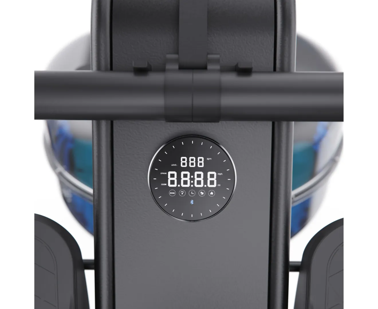 На круглом LCD-дисплее отображаются время, дистанция, скорость, калории, количество гребков, частота, время на 500 м и уровень нагрузки. Есть Bluetooth для подключения к приложениям FITLOG и KINOMAP. Там можно смотреть тренировки, отслеживать статистику и участвовать в онлайн-занятиях.