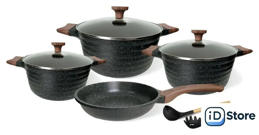 набор кастрюль, алюминий, покрытие отсутствует, крышка стеклянная. Доставим по Минску в день заказа, при оформлении заявки до 14.00. Официальная гарантия.