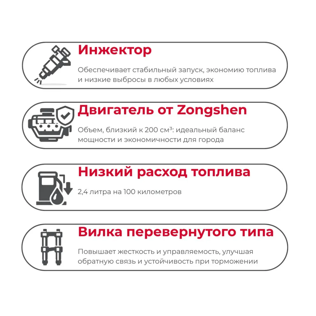 – Надежный и проверенный временем двигатель от Zongshen. Объем, близкий к 200 см³, является идеальным балансом между экономичностью и достаточной мощностью для активного передвижения в городском потоке.