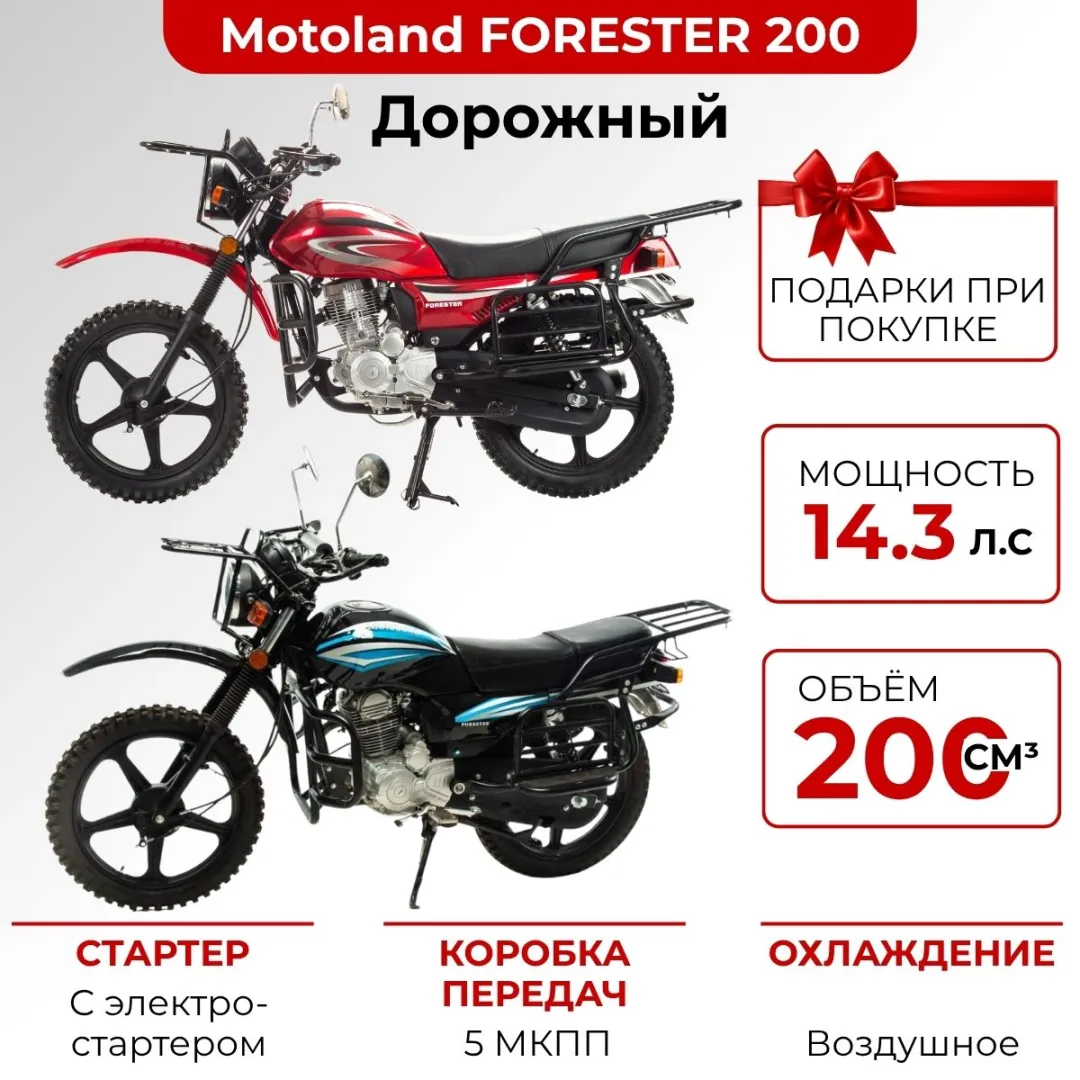 Forester 200 MotoLand мотоцикл уникальный: он отличается хорошей системой воздушного охлаждения двигателя, отличной проходимостью, за счет мощного двигателя, широких колес и безопасной подвески. Благодаря набору этих характеристик вы будете уверенно чувствовать себя при езде по дорогам с любым покрытием.