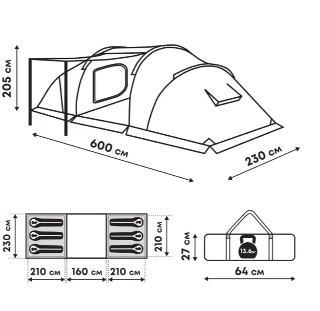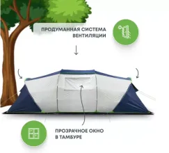 По центру — тамбур, по бокам — две спальни, каждая на троих. В тамбуре есть прозрачное окно с занавеской, съёмный пол и полноценная входная дверь, которую можно превратить в козырёк-навес при помощи стальных разборных стоек из комплекта. Вход закрыт москитной сеткой, а по всему нижнему периметру пришита ветрозащитная юбка — насекомые внутрь точно не проберутся.