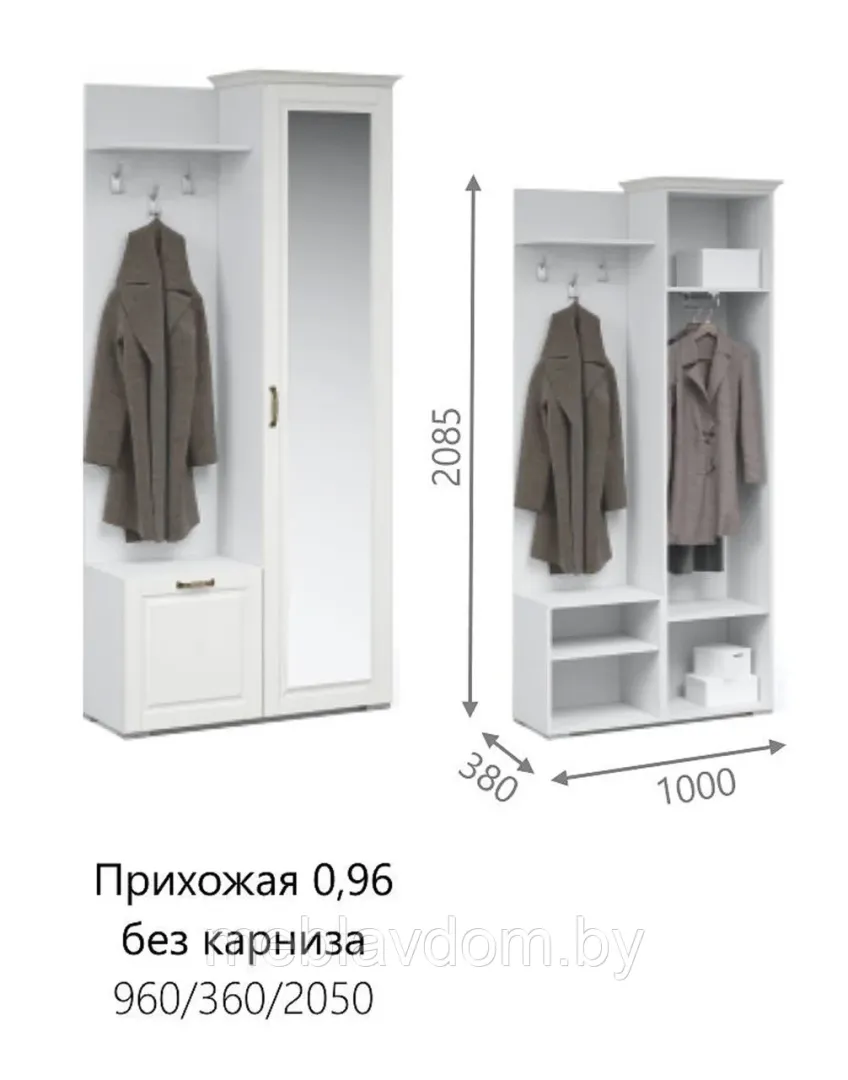 Функциональная прихожая в стиле неоклассики отвечает последним трендам дизайна мебели, поможет правильно организовать систему хранения даже в небольшом помещении. Фрезерованные фасады из МДФ с текстурой дерева, фигурный карниз и стильные металлические ручки цвета бронзы придают изысканность, а белоснежный цвет декора расширяет пространство. Широкий выбор модулей позволяет создать систему хранения, подходящую для вашего проекта.