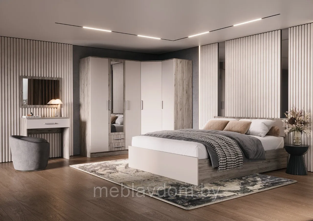 Модульная спальня Мартина с угловым шкафом— это изысканный набор мебели, сочетающий в себе минималистичный дизайн без излишеств и высокую функциональность. Неброский и ненавязчивый цвет элементов позволяет легко интегрировать их в любой интерьер.