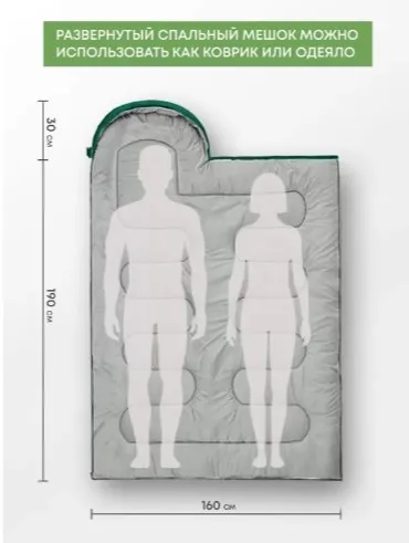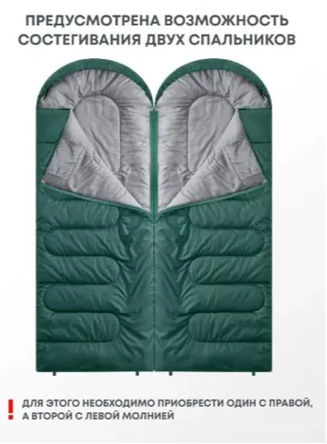 Два спальника с разным направлением молнии можно состегнуть в один шириной 160 см — для двоих или двоих с ребенком.