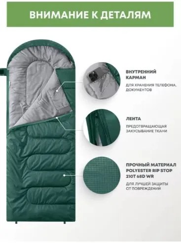 Для защиты от холода в области груди и ног предусмотрены усиленные секции с дополнительной набивкой. Внутри есть карман для телефона или документов, в комплекте — подушка. Защитная лента на молнии предотвращает закусывание ткани и увеличивает срок службы.